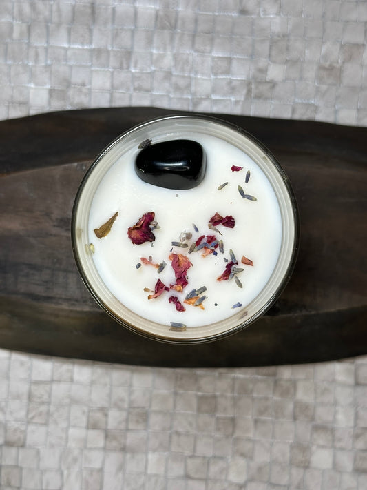 Black Obsidian Infused crystal candle - Meadow Lily & Cotton Musk Scent (200g)