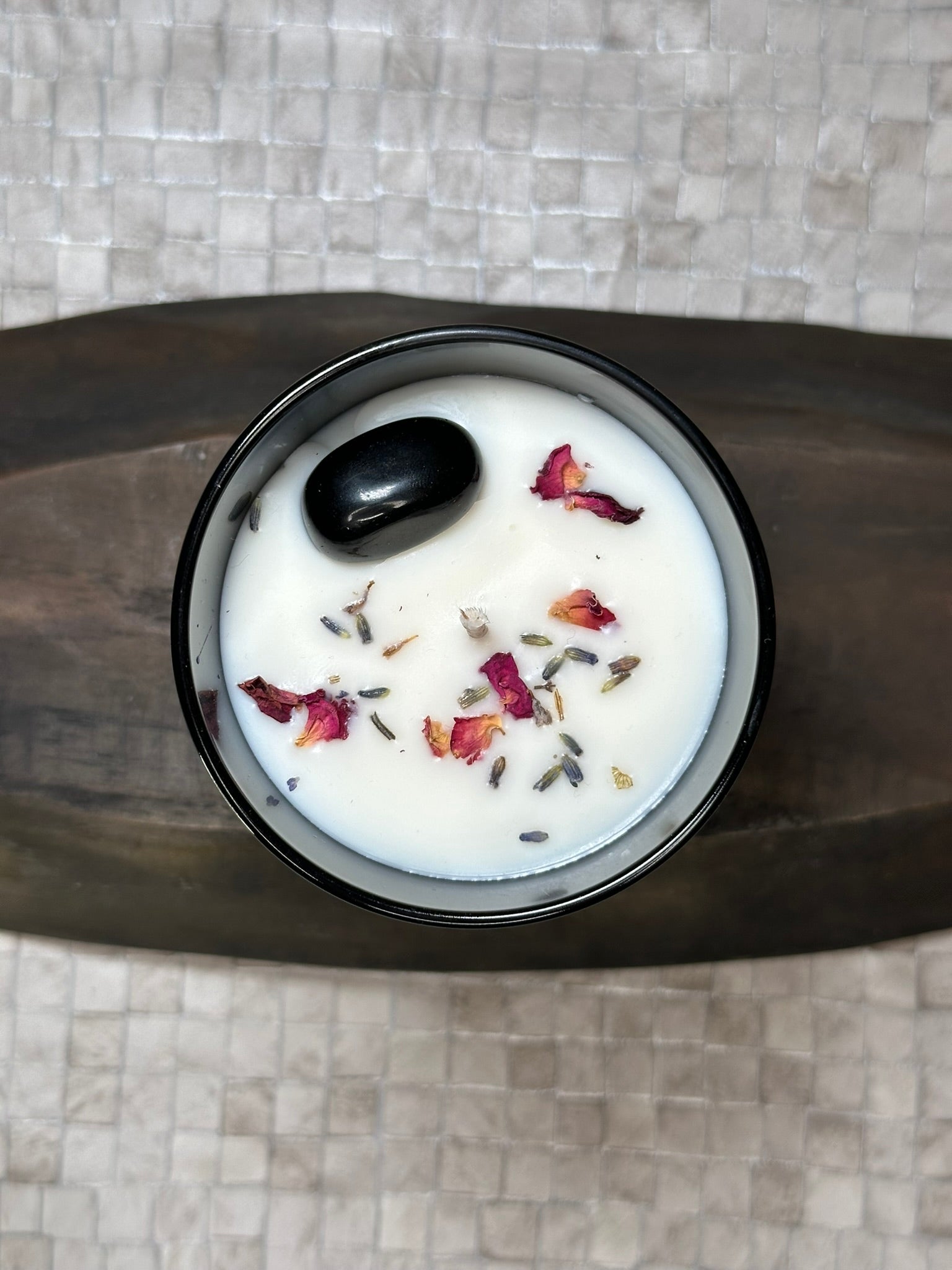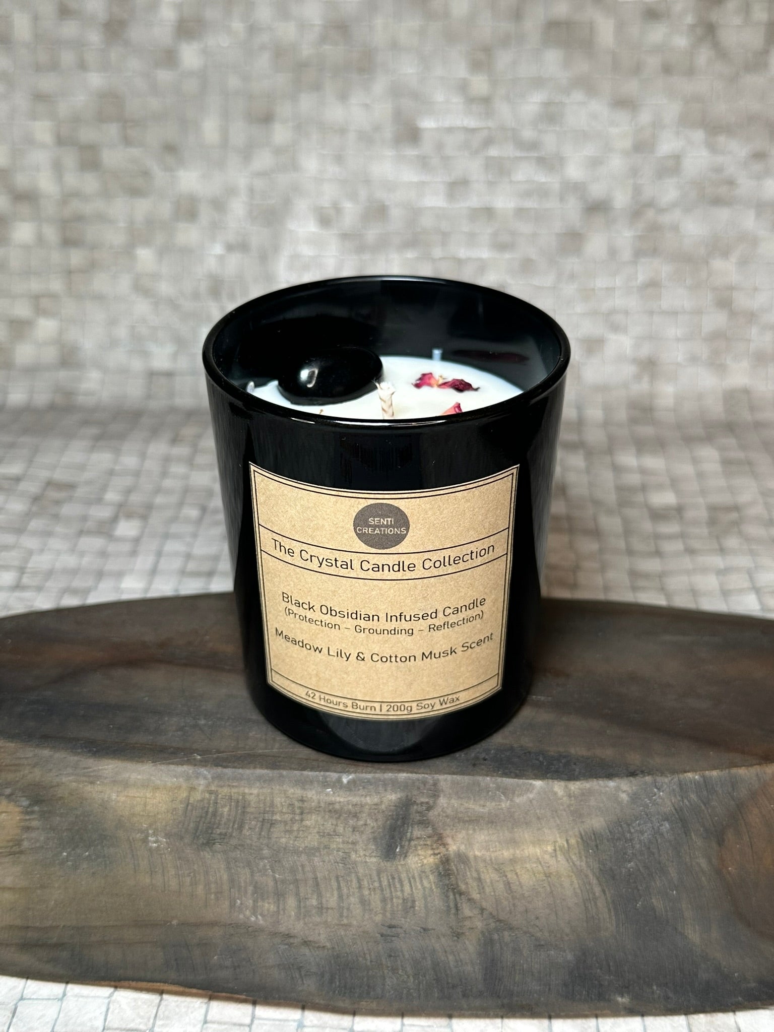 Black Obsidian Infused crystal candle - Meadow Lily & Cotton Musk Scent (200g)