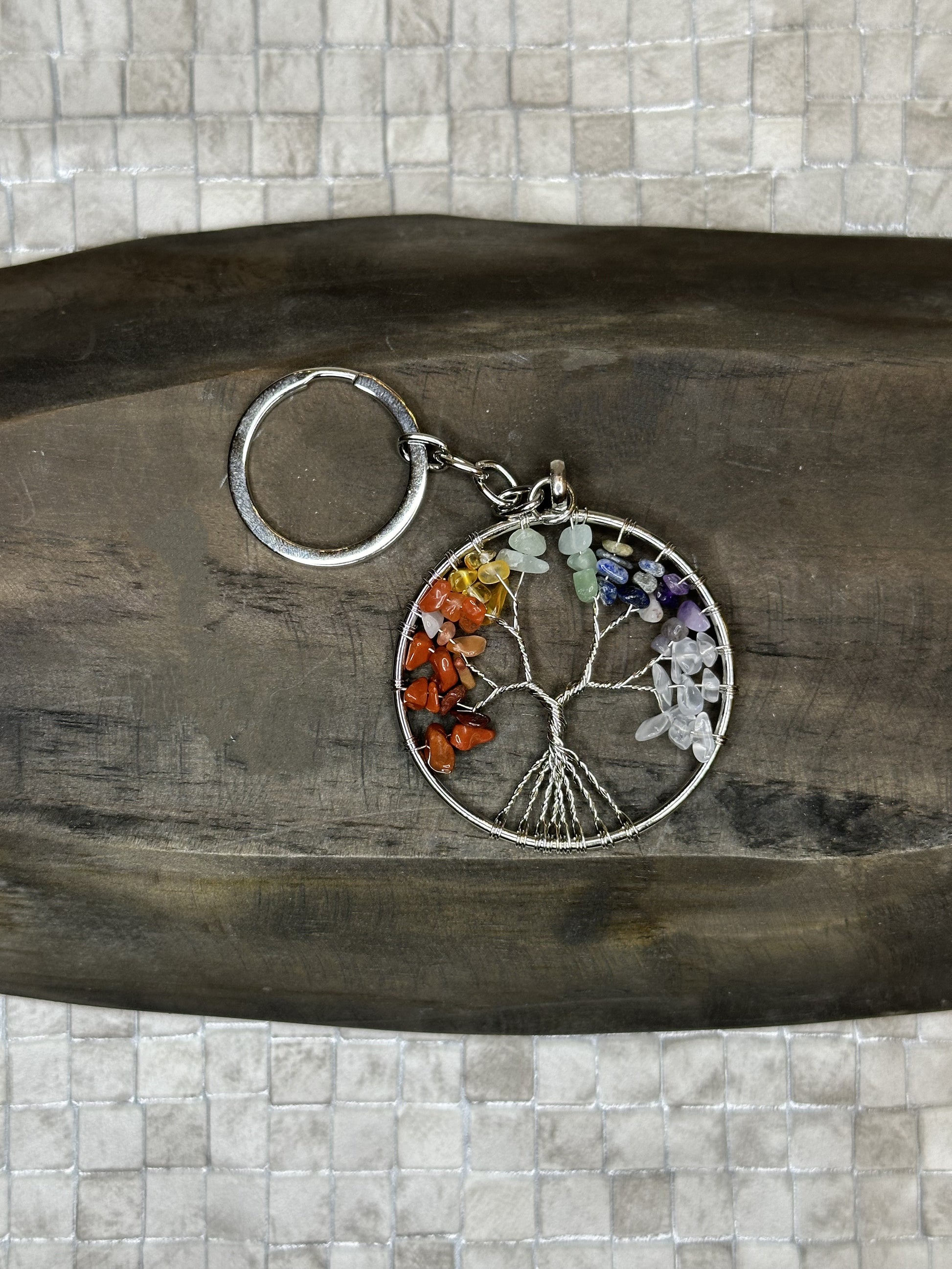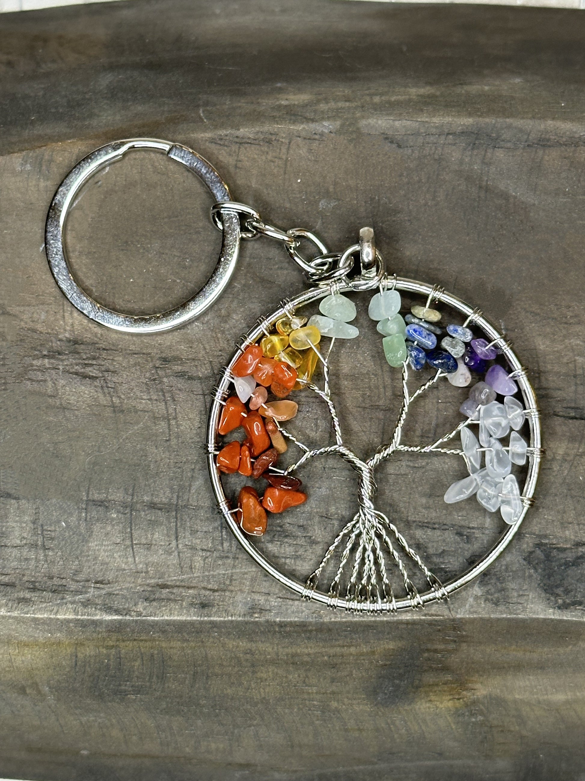 Chakra Tree Keyring. 7 crystals attached to each branch of the tree.