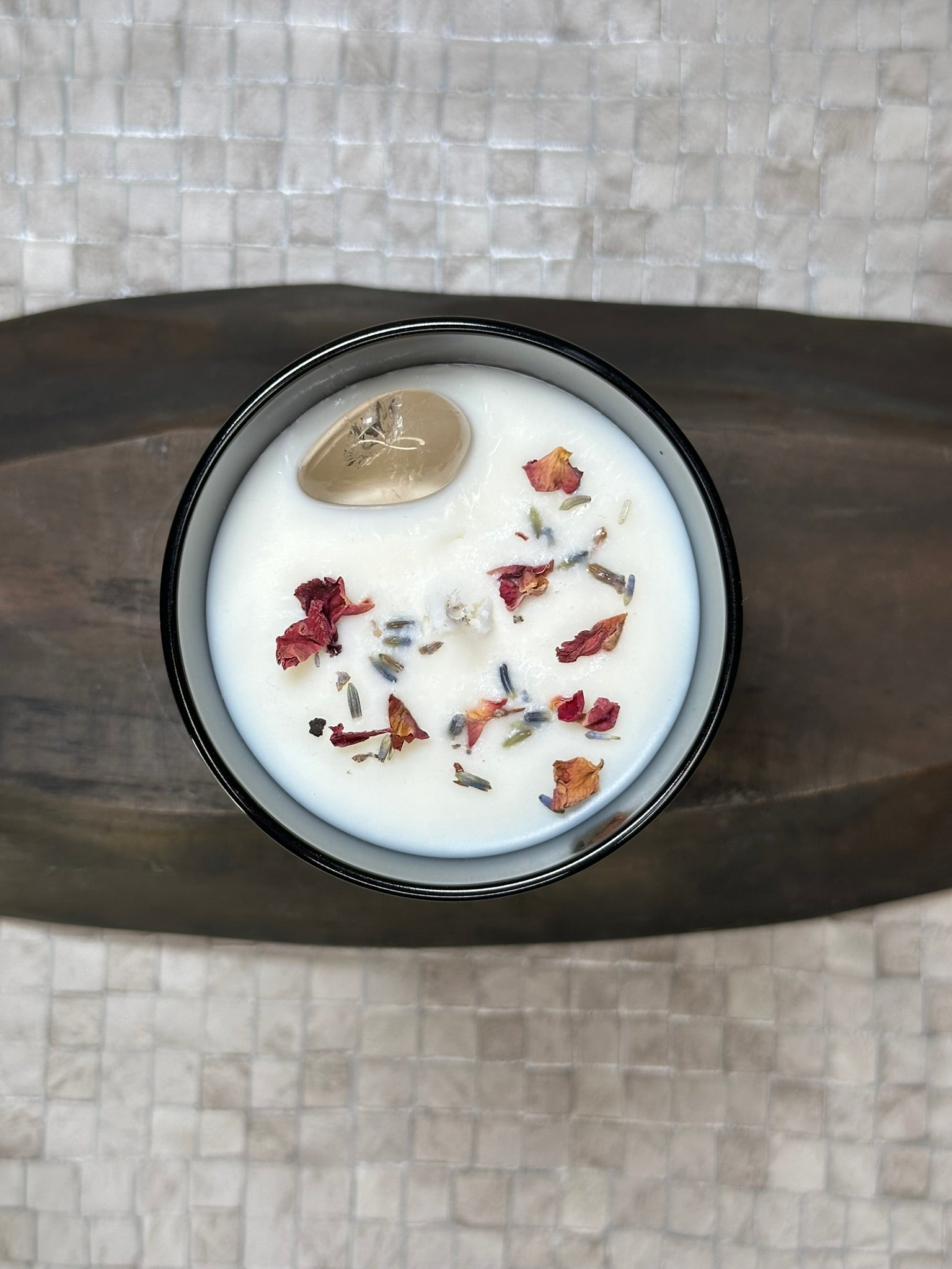 Each candle is infused with a crystal tumble stone