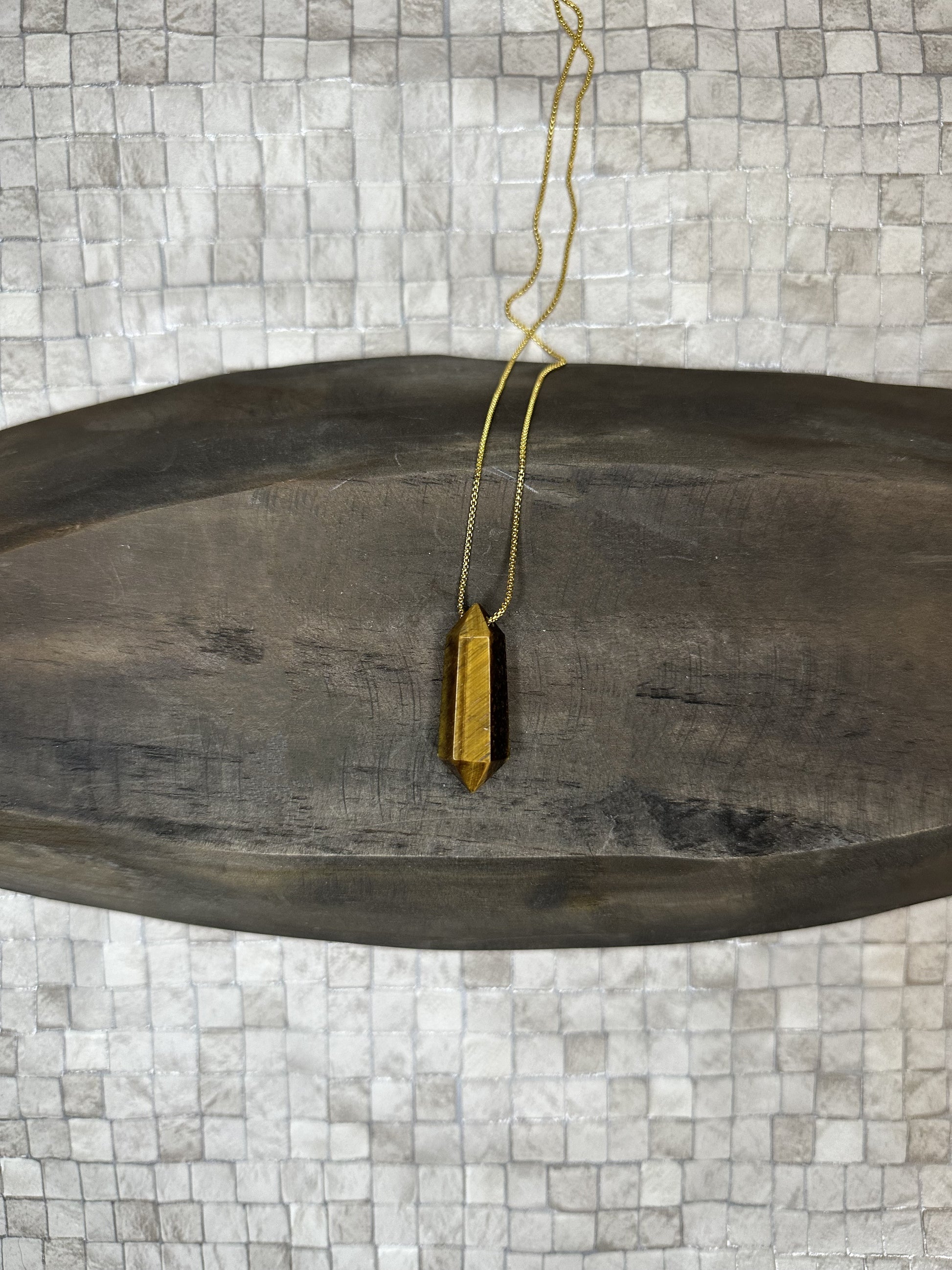 Golden Tiger's Eye Hexagon Crystal Point Necklace. gold plated.